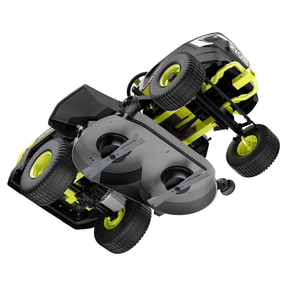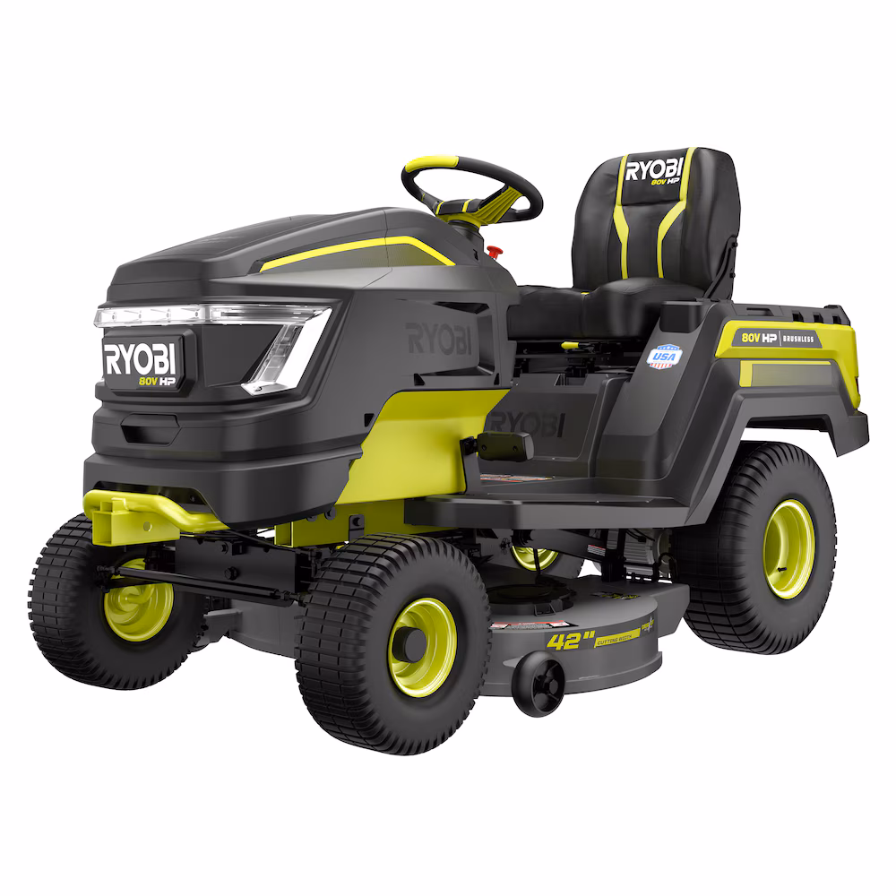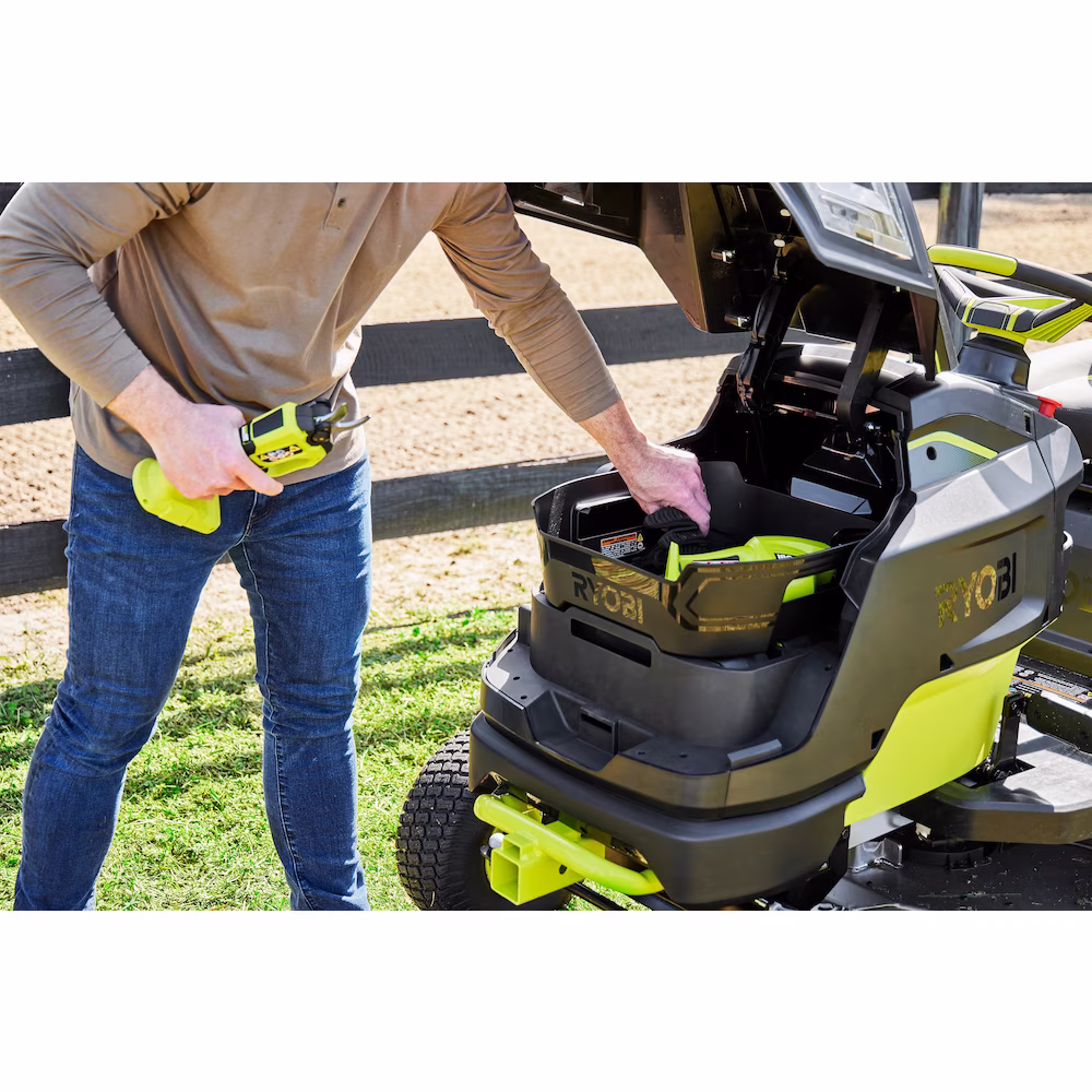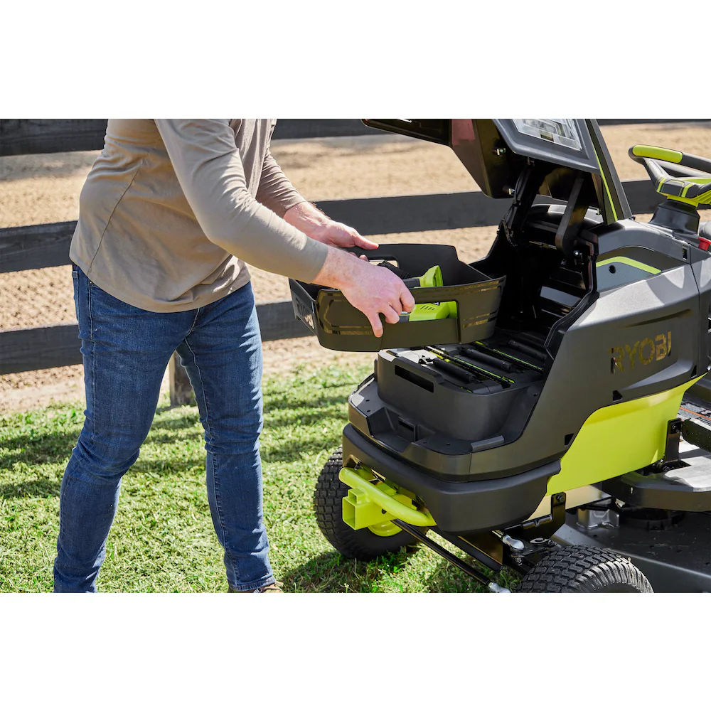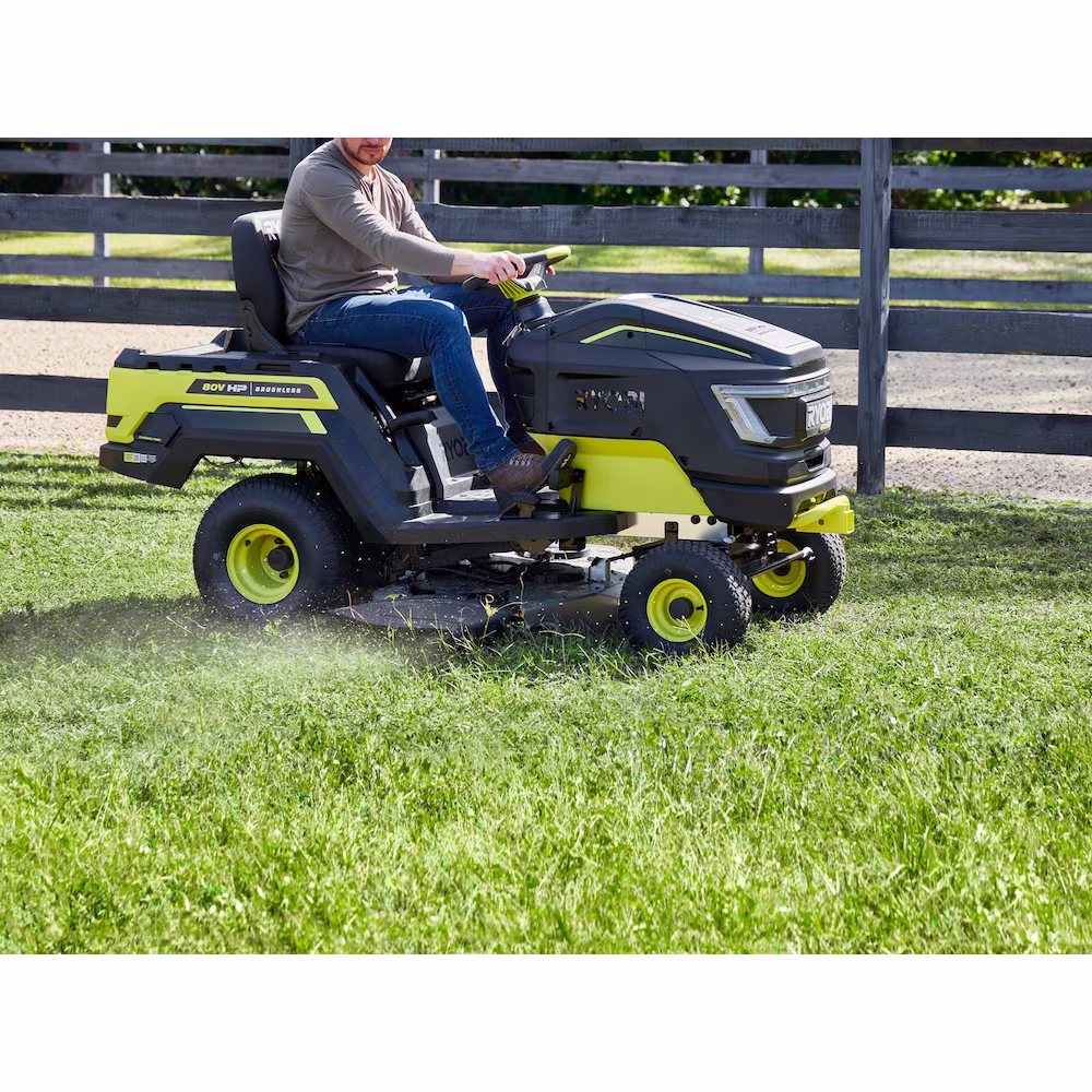 Introducing RYOBI's first lithium-ion battery powered Riding Lawn Tractor, the RYOBI 80V HP 42" Lithium Electric Riding Lawn Tractor. 80V HP Technology combines brushless motors, advanced electronics, and lithium-ion batteries to deliver the power equivalent to a 21 horsepower gas engine, delivering all the power, without gas, engine maintenance, and significantly less noise. This tractor is powered by 3 brushless motors and 3 80V 10Ah batteries to cut up to 2 acres per charge. When the job is done, the tractor fully recharges in less than 2.5 hours with the included Hyper Charger and on-board charging port. The most versatile Riding Lawn Tractor in the industry features front and rear storage compartments to haul mulch, logs, plants, or any material around the yard. Make quick work of towing, with a capacity of 500 lbs. and a universal 2 square hitch in the front and rear of the Tractor. The Tractor is equipped with a 10-gauge heavy-duty fabricated steel deck and the CROSS CUT multi-blade system that uses 4 steel blades to achieve a superior cut. Remove the deck in under 90 seconds for quick blade maintenance. The full color back lit LCD screen displays runtime, battery level, and charge status while the RYOBI Riding Mower app allows you monitor your charge status from your phone. This Tractor has a 5-year limited warranty.
