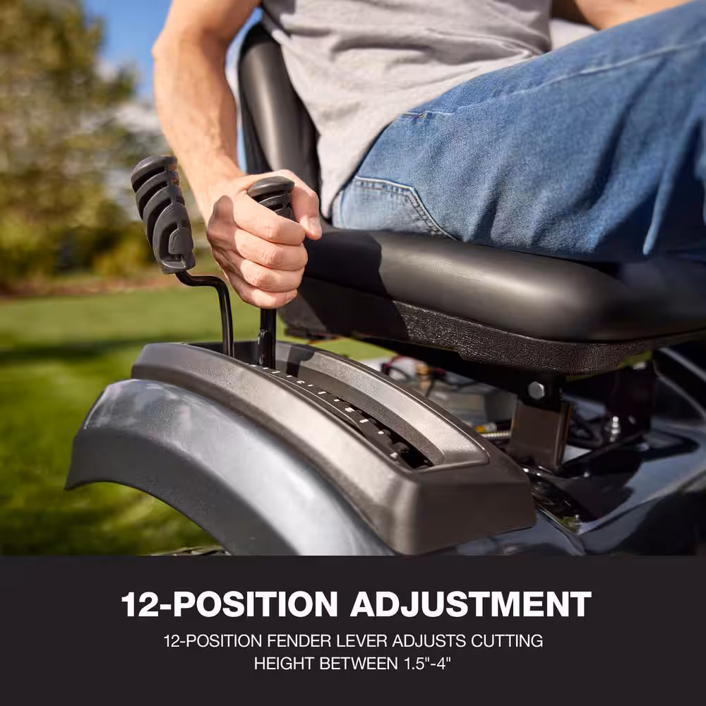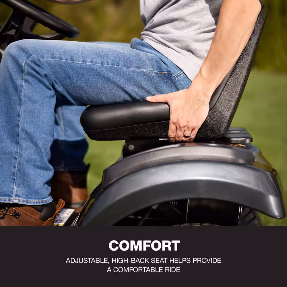 Adjustable Cutting Height, Adjustable Speed, Assembly Required, Battery level indicator, Built-in Hitch, Cruise Control, Cup Holder, Deck cleanout, Headlights, Hour Meter, Keyed start, Pneumatic Tires, Residential, Reverse Mowing, Rust resistant deck, Single-lever height adjustment, Translucent Fuel Tank