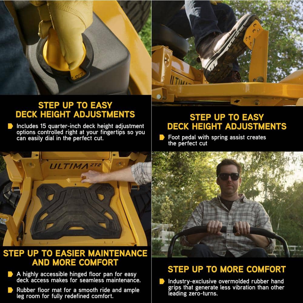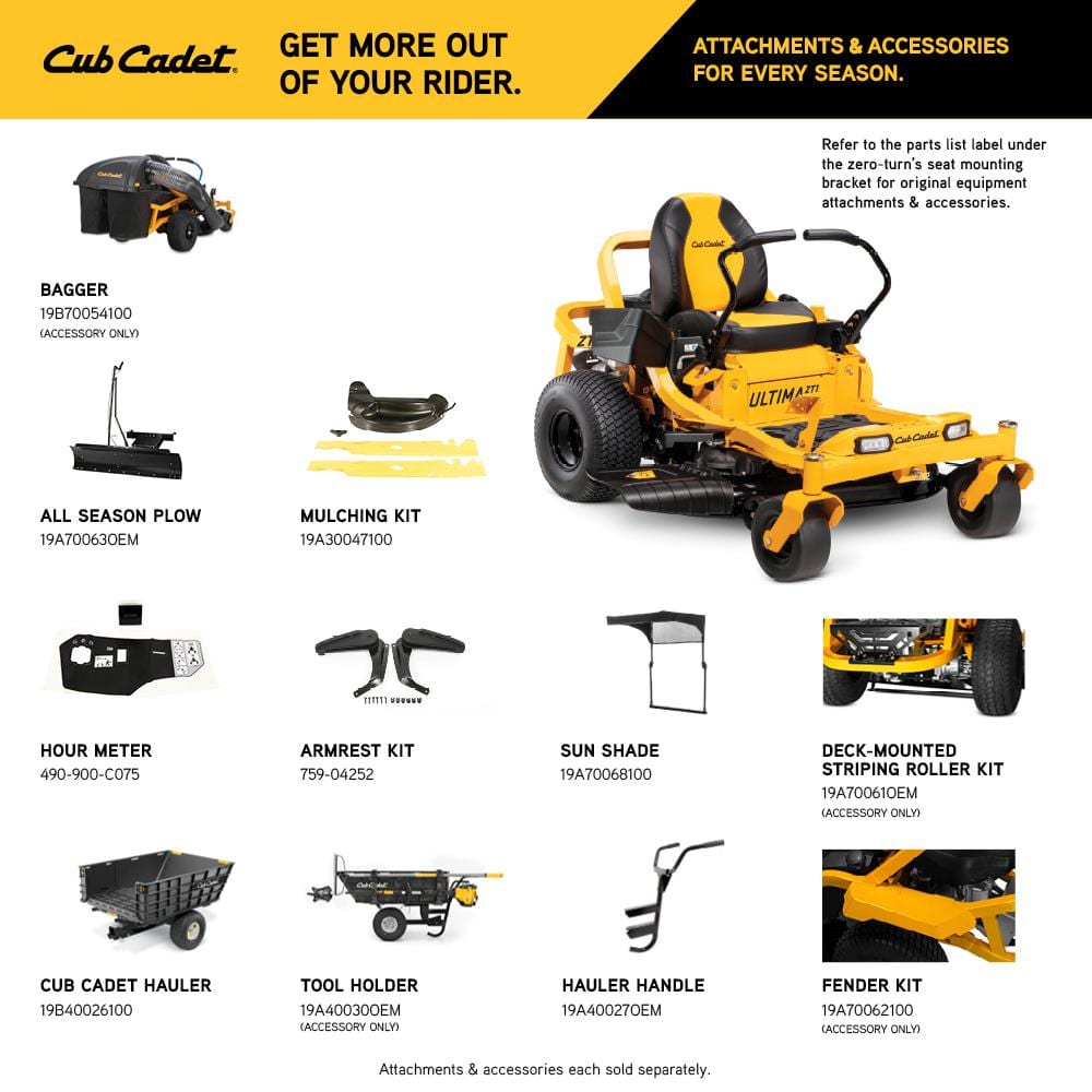 Step up to the ultimate all-around mowing experience with the Ultima Series from Cub Cadet. The ZT1 46 zero-turn mower features a 21.5 HP/726cc Kawasaki FR series twin-cylinder engine that delivers high-performance power for a consistent cut. The 46 in. AeroForce fabricated deck features a cutting system that delivers a signature cut, with fewer clumps and stragglers, finer clippings and increased evenness of cut. A muscular, 2 in. x 2 in. tubular steel frame holds up against the toughest obstacles. You'll ride in elite comfort with a 20 in. high back seat with a durable advanced polymer seat suspension, adjustable lap bars with ergonomic hand grips, a rubber floor mat and ample leg room. An AGM battery provides reliable starting with a slower discharge so you won't have to worry about it going dead during the offseason. By adding our optimized bagging system, specifically designed to prevent clumping and blockage, you get even more from your mowing experience. Ideal for mowing slight rolling hills and several obstacles up to 2 acres. Backed by a strong 3-year/unlimited-hour warranty, limited lifetime warranty on frame and deck and a nationwide network of Cub Cadet dealers for expert service and support, you'll get the ultimate mowing experience with the Cub Cadet Ultima Series.