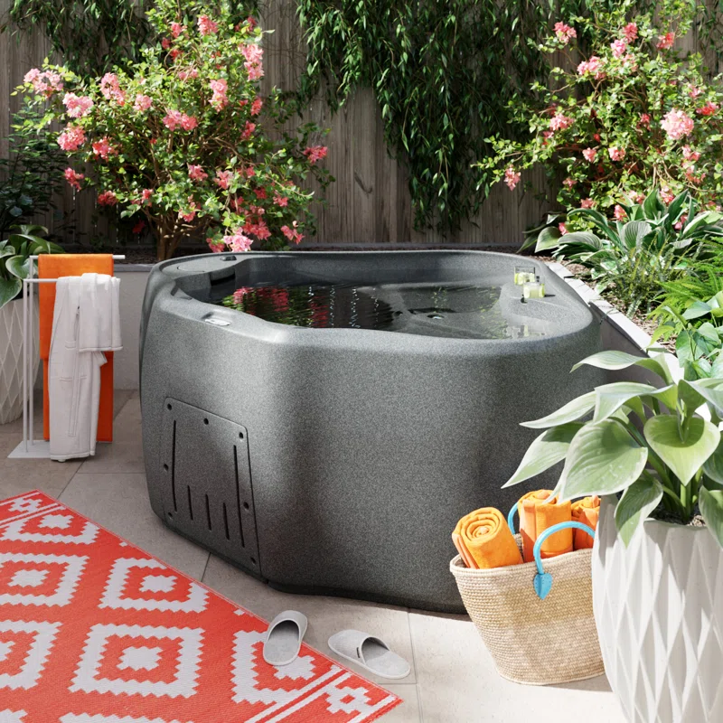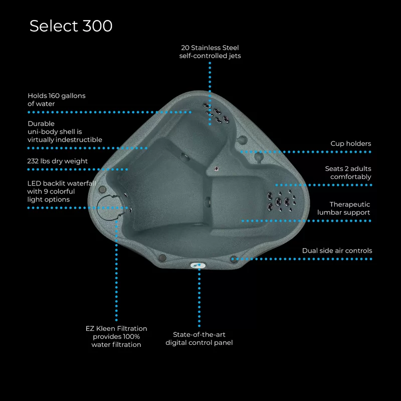 The AR-300 Select by AquaRest Spas is a large 2-person hot tub with 20 two-tone stainless-steel jets, including soothing foot massage jets, powered by a 1.5hp Jacuzzi pump. Enjoy the ambiance created with the patented LED backlit waterfall with 9 color settings and 2 deep cup holders. Relax knowing that every AquaRest Spa includes an ASTM-certified locking safety cover and full foam insulation, keeping the leaves and debris out of the heat inside of your hot tub, making it incredibly energy efficient, meeting the strict California Energy Commission (CEC) standards. AquaRest Spas are manufactured using state-of-the-art roto molding technology, producing an extremely durable and unbelievably portable hot tub, resistant to all types of weather and weighing in at only 232 lbs. Spend more time enjoying and less time maintaining your tub with the patented AquaRest Easy Kleen 100% filtration system. The AR-300 follows the “Simple, Portable, Durable, and Affordable” philosophy that has helped AquaRest Spas become the #1 online hot tub manufacturer. Residential delivery and factory warranty included. Proudly Made in the USA! - 68" x 67" x 31" - 232 lbs - 160 Gallons - 20 stainless steel jets, including 2 for your feet - 120-volt Plug-n-Play electrical - Digital Control - Jacuzzi 1.5HP pump - Patented LED backlit waterfall with 9 color settings - Patented Easy Kleen 100% water filtration system