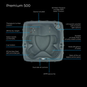 The Premium 500 includes an impressive upgraded package. 29 Stainless Steel hydrotherapy jets, ozone and 2 HPR 2 speed pump. Finally, a REAL spa, with REAL therapeutic benefits at a price that is equally relaxing. Best of all, it’s still 120-Volt so its ready for fun. Simply fill it up, plug it in and soon you’ll relax in your own backyard oasis. This Spa delivers optimum performance and requires less energy with full foam insulation and the ASTM certified safety cover. Proudly made in the USA! Built to last and engineered with tough, impact-resistant polyethylene. It’s outstanding value, comfort and quality are comparable to other spas but at a fraction of the cost. Relaxing but high performing hydrotherapy is delivered through 29 Stainless Steel Jets with dual side air control giving you full control. Your Massage, Your Way. The therapeutic lumbar arch support alleviates achy backs and the multi-level jet placement targets your muscles just right. Take relaxation to a whole new level with patented multi-color LED backlit cascading waterfall with 9 colorful light settings to help create the perfect ambiance. The EZ Kleen Filtration System, providing 100% water filtration, combined with a factory installed Ozone Purification System, which eliminates up to 75% of chemicals, work together to keep the water crisp and clean. At 295 lbs., its easily portable too. This Spa ships Plug and Play ready for 120-Volt 15 Amp with a 1kW heater. The spa can be converted from a 120-Volt 1kW to 240-Volt 4kW with the installation of a 30 or 50 Amp 240-Volt electrical service. Install on any solid flat level surface capable of handling specified load. So relax and enjoy this affordable, comfortable spa without breaking the budget. Our quick ship guarantee gets you enjoying your spa life sooner.